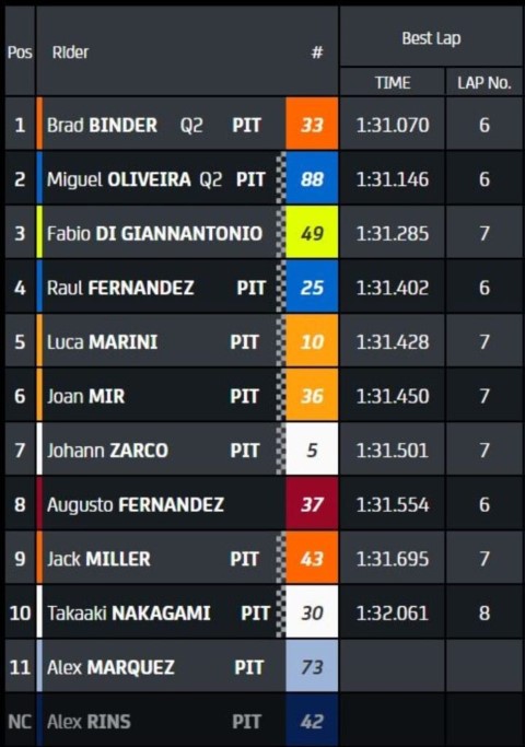 A falta de tres minutos, era Raúl Fernández quien se colocaba en segunda posición, por detrás de su compañero de equipo y echando a Mir de la Q2 provisional. Poco después, era Brad Binder quien ascendía hasta la primera posición, con un tiempo de 1:31.070. A falta de un minuto y medio, Augusto Fernández sufría una nueva caída en el trazado de Misano, en la curva 3. Alex Márquez, por su parte, no pudo mejorar los tiempos, y saldrá último en parrilla ante la ausencia de Álex Rins; que será baja para el resto del fin de semana.