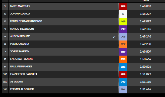 En medio del caos, Marc Márquez empezó a construir su estrategia. Con neumático medio nuevo, fue encadenando mejoras progresivas hasta colocarse en cabeza. Primero por milésimas. Después con autoridad, rebajando en medio segundo su registro anterior. El mensaje era claro: no solo estaba compitiendo, estaba gestionando la sesión con precisión quirúrgica. Cada vuelta, un ajuste. Cada sector, una declaración de intenciones.