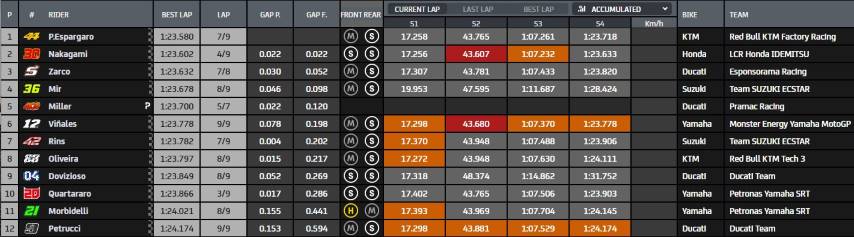 En los últimos minutos, Jack Miller también ha comenzado a mejorar su tiempo. El australiano se ha ido al suelo en la FP3 y ha salido a la clasificación con dolor. Esto no le ha impedido dar un paso adelante en la segunda mitad de la sesión, colándose en la tercera posición. En esta misma vuelta, Espargaró conseguía colocarse primero. Muchos han sido los pilotos que el último minuto han mejorado sus tiempos. No ha sido el caso de Quartararo, que ha caído hasta la novena posición.