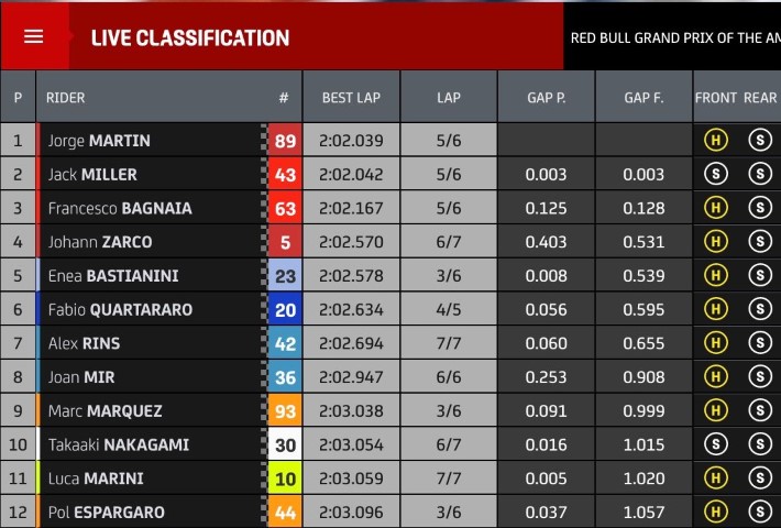 A pesar del gran ritmo demostrado durante la jornada del viernes, los pilotos de Aprilia, Aleix Espargaró y Maverick Viñales han tenido que pasar por la Q1. También ha sido el caso de Álex Rins, que demostró un gran ritmo durante el primer día en el Circuito de las Américas. La otra cara de la moneda ha sido la de Fabio Quartararo, que ha marcado el mejor tiempo durante la FP3. Marc Márquez ha logrado colarse directamente en la Q2 en el fin de semana de su regreso a la competición, logrando el segundo puesto durante la última sesión de entrenamientos libres.