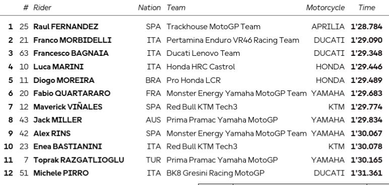 El mano a mano entre Morbidelli y Fernández comenzaba, sacando a Bagnaia de la pelea por la pole, con el del VR46 recuperando el primer lugar. El de Trackhouse, sin embargo, no daba su brazo a torcer; y recuperaba el primer lugar con un tiempo de 1:28.784. Pecco Bagnaia trataba de mejorar su posición y colarse en la Q1, pero no lograba marcar una buena vuelta. Una caída de Morbidelli, ya con el cronómetro a cero, acababa con las oportunidades de mejorar. El italiano, aún así, entraba en la Q2 junto a Raúl Fernández.