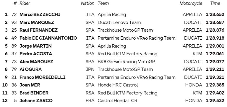 Bezzecchi no se detenía ahí, bajando su registro hasta 1:28.652; al tiempo que Márquez ascendía hasta el sexto lugar. Raúl Fernández, por su parte, se hacía con la tercera posición, dejando a tres Aprilia en las tres primeras posiciones. Ya en el segundo run, Marc Márquez comenzaba con fuerza, rodando en rojo. El de Ducati, sin embargo, no podía superar a Bezzecchi en el último sector. En cualquier caso, le valía para situarse segundo a falta de casi tres minutos para el final.