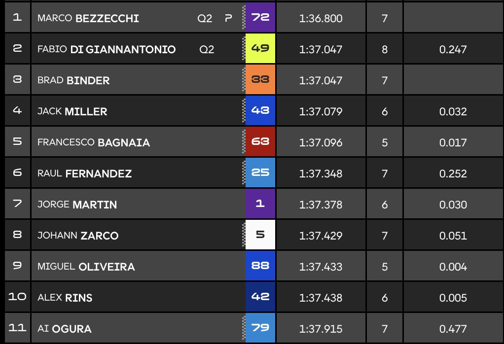 Jack Miller sorprendía en línea de meta y se ponía en segunda posición por tan solo diecisiete milésimas. A falta de un minuto, Brad Binder se colocaba segundo. Finalmente y con el crono ya en cero, Fabio Di Giannantonio era quien se llevaba esa preciada segunda posición, consiguiendo junto con Bezzecchi ese paso a la Q2. Sorprendentemente, el piloto del VR46 ha hecho exactamente el mismo tiempo que Brad Binder, en 1:37:047, pero la vuelta era para el italiano.