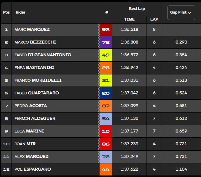 Acosta marcaba el primer tiempo poniéndose en décima posición, mientras que Di Giannantonio se colocaba tercero. Bezzecchi marcaba sectores en rojo y finalmente se colocaba segundo. Pol Espargaró caía al suelo en la última vuelta. El cronómetro llegaba al final y Marc Márquez era quien se llevaba la primera posición, seguido de Bezzecchi y Fabio Di Giannantonio, que formarán la primera fila. Pedro Acosta saldrá en séptima posición, mientras que Alex Márquez no ha sido capaz de clasificar mejor que el onceavo. Recordemos que aún así, el piloto del Gresini deberá cumplir la sanción de tres posiciones en parrilla en la carrera del domingo, por lo que saldrá en la decimocuarta posición.