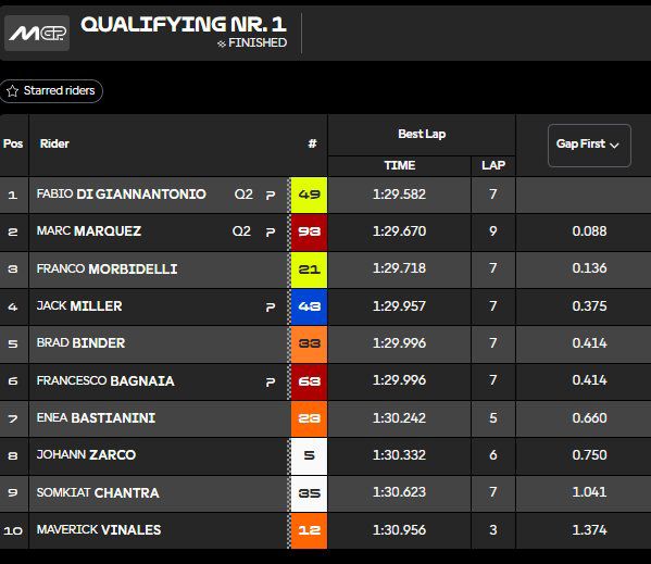 Empezaba a moverse la bandera a cuadros y finalmente eran Di Giannantonio y Márquez los que pasaban a la Q2. Pecco Bagnaia en problemas, pues saldrá decimosexto tanto en la carrera sprint como el domingo.