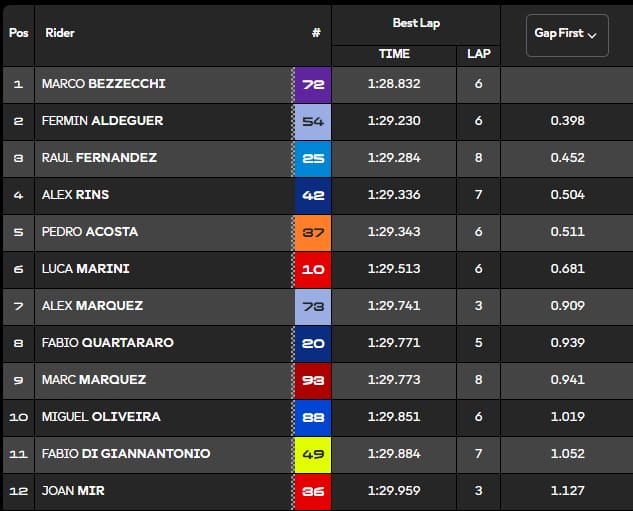 Pedro Acostaba echaba por el momento a Aldeguer de esa segunda posición, mientras que Bezzecchi era el único que mejoraba su propio registro. Tanto es así, que el italiano de Aprilia hacía el récord del circuito, mientras que Aldeguer pasaba por meta y se colocaba segundo. Momentos después nos enseñaban una caída de Alex Márquez.