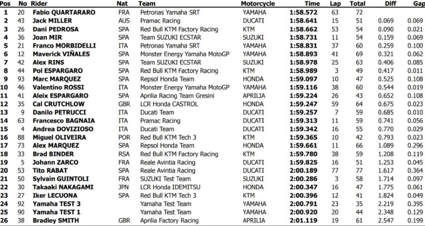 Quartararo sigue demostrando que es uno de los mejores pilotos de la parrilla buscando tiempo. Segundo día de test que domina de forma consecutiva dejando el crono en 1’58’’572. El francés ha rebajado los tiempos por la tarde y le ha arrebatado el primer puesto a Jack Miller, que había sido el dominador de la mañana, por tan solo 69 milésimas.