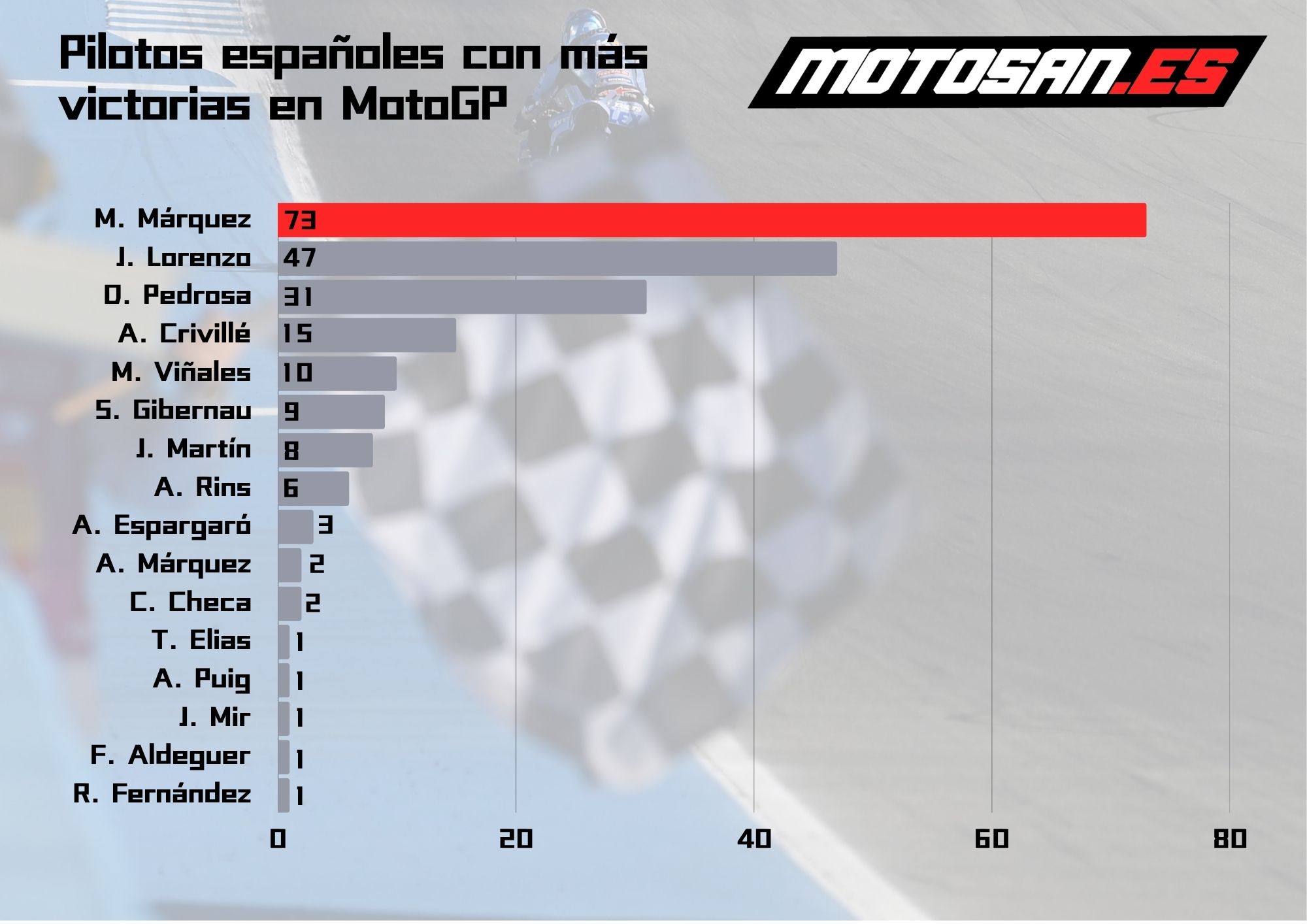 Como no podía ser de otro modo, Marc Márquez se encuentra en lo más alto de este ranking. Desde su llegada a MotoGP en 2013, el de Cervera ha cosechado un total de 73 victorias que le han permitido ganar siete títulos mundiales en la categoría reina. El de Ducati ha logrado once victorias esta temporada, antes de lesionarse durante el Gran Premio de Indonesia.