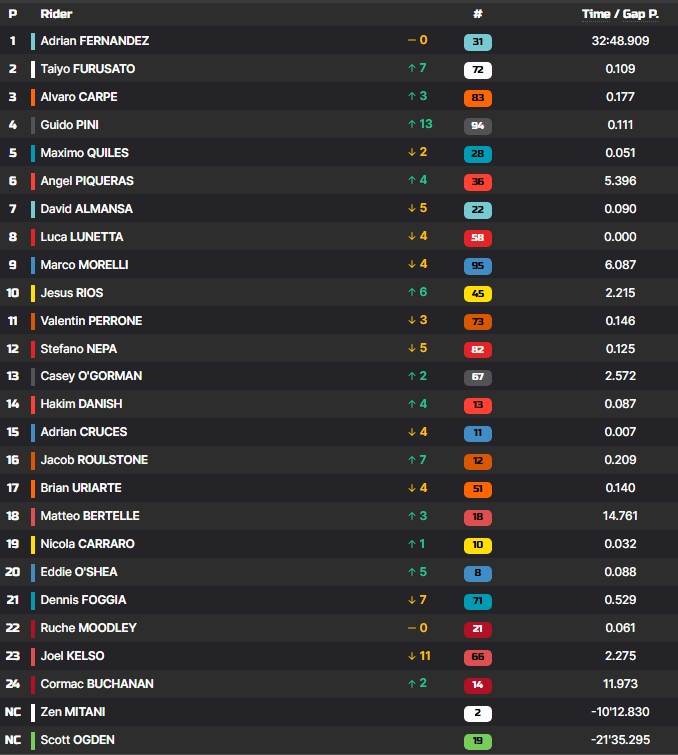 La última vuelta ha sido un baile totalmente de todos los pilotos tratando de seguir en pie, con un grupo de cabeza amplio lo que indica que todos querían mantener su posición. Pero Adrián Fernández ha conseguido lo que quería: su primera victoria en el Mundial de Moto3. Taiyo Furusato y Álvaro Carpe han sido respectivamente segundo y tercero para completar el podio en Valencia. Todo cambiaba con una penalización a Furusato por pisar fuera en la última vuelta, cediendo una posición: Carpe terminaba segundo y Furusato tercero.