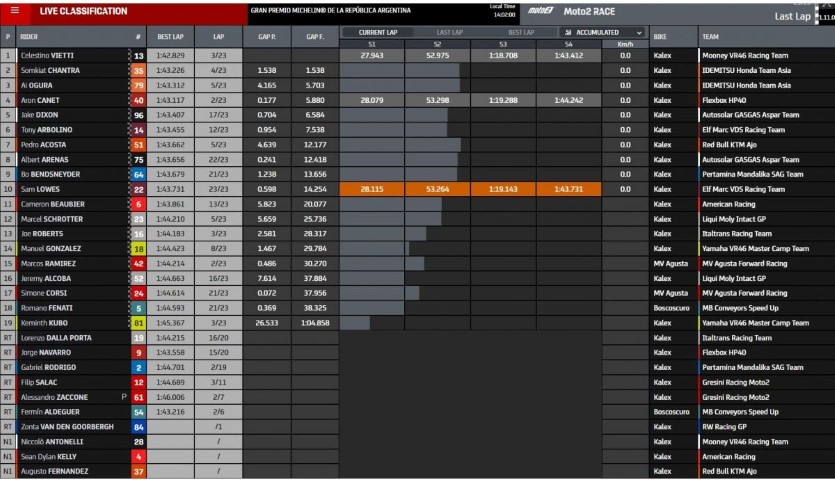 Volviendo a Fernández y Aldeger. El mallorquín salió mal y pecó su error cayéndose en la primera curva de la carrera. Aldeguer sí aprovechó su condición de poleman yéndose junto con un Vietti que sería el claro protagonista. El italiano no solo salió vencedor en Termas de Río Hondo, sino que protagonizó la acción donde Aldeguer terminó por los suelos. En clave española cabe destacar al mencionado Canet, así como a Pedro Acosta. El murciano terminó séptimo. Albert Arenas, octavo; Manuel González, décimocuarto; Marcos Ramírez, decimoquinto. Fuera de los puntos: Jeremy Alcoba, Jorge Navarro, Fermín Aldeguer y Augusto Fernández.