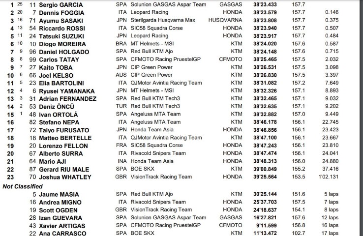 Se antojaba una carrera apasionante donde un jovencísimo Fermín Aldeguer podría hacer historia. A su lado, Augusto Fernández también tenía la esperanza de conseguir el primer podio de la temporada. No obstante, nada salió como ambos esperaban. Los dos claros favoritos terminaron en el suelo en una carrera que ganó Celestino Vietti, con Chantra y Ogura completando el podio. El mejor español fue Aron Canet, que luchó hasta el final por encadenar su tercer podio seguido.