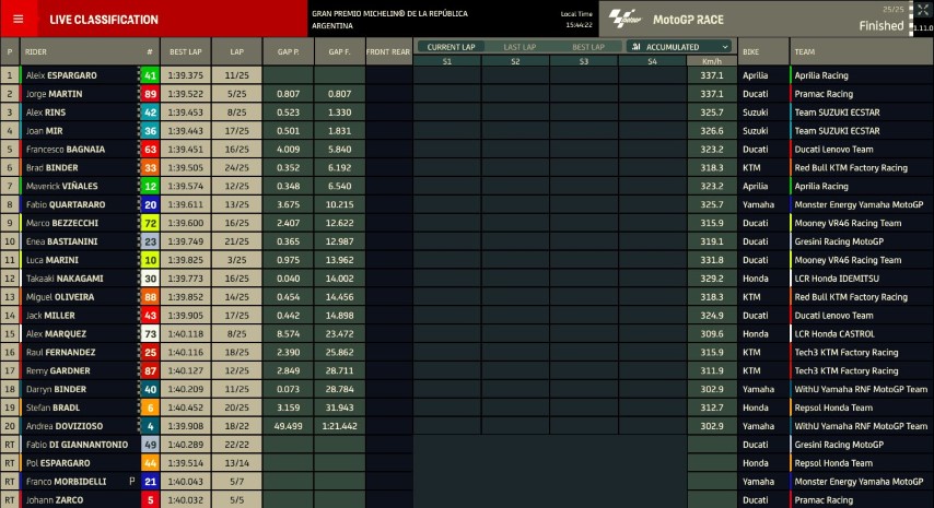 La jornada de sábado ya dejó entrever que Aleix Espargaró estaba un paso por delante que el resto. El catalán consiguió la pole en un día muy estresante para todo el paddock, pero el trabajo tiene su recompensa. La salida de Aleix, así como la de Martín, fue excelente. Ambos tenían un plus y, de la mano, se alejaron poco a poco. La Ducati del madrileño funcionó a la perfección, y dominó la carrera en gran parte de la vueltas. Por atrás había también luchas muy interesantes. Una de ellas, la del podio: Pol Espargaró aguantó a Rins hasta que el de Honda se fue al suelo. Más atrás, Mir consiguió abrir brecha ante los Viñales, Bagnaia o Binder, que se tuvieron que consolidar con luchar por quedar en el top5. El actual campeón, Fabio Quartararo, volvió a tener varios fantasmas. El francés fue de menos a más y finalmente pudo terminar octavo. En clave española Álex Márquez terminó en los puntos, decimoquinto; con Raúl Fernández justo por detrás, decimosexto.