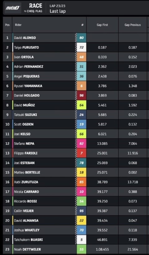 A falta de dos vueltas para el final, Jorge Martín se iba al suelo en la Curva 1, dejando a Bagnaia la victoria y el liderato del Mundial en bandeja. Afortunadamente, el madrileño no sufría daños. Por detrás, Marc Márquez llegaba hasta su hermano, superándole en la pelea por la segunda posición. Los hermanos celebraban así su primer podio juntos como pilotos de Gresini. Finalmente, Bastianini cruzaba la línea de meta en cuarto lugar.
