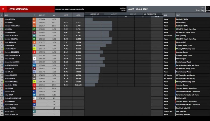 Primera vuelta agónica. Augusto Fernández salió a lo suyo, pero por detrás pasó absolutamente de todo. Alonso López, Albert Arenas, Jeremy Alcoba y Manu González se fueron al suelo en los primeros compases. Una vez asentadas las posiciones, otro grupo de españoles empezaron a luchar por los puestos más altos de la carrera. Hablamos del mencionado Fernández, Pedro Acosta y Aron Canet.