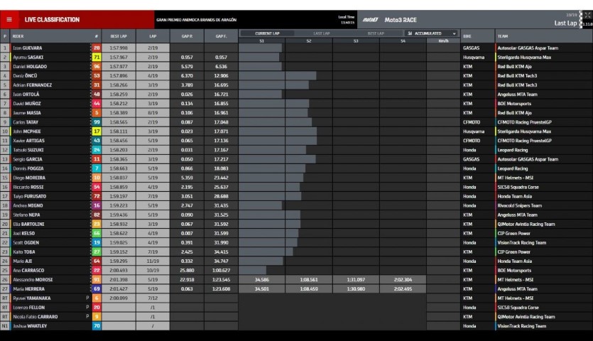 Con Guevara lanzado desde la primera curva, tan solo Ayumu Sasaki y Daniel Holgado pudieron seguirle el ritmo. Finalmente ellos fueron los que completaron el podio de Aragón. El del español de KTM, el primero en el Mundial. Por atrás, la típica lucha interminable entre una multitud de pilotos. Una lucha, eso sí, por la cuarta posición. Y es que tanto Guevara como Sasaki y Holgado lograron abrir una brecha superlativa de unos diez segundos de distancia.