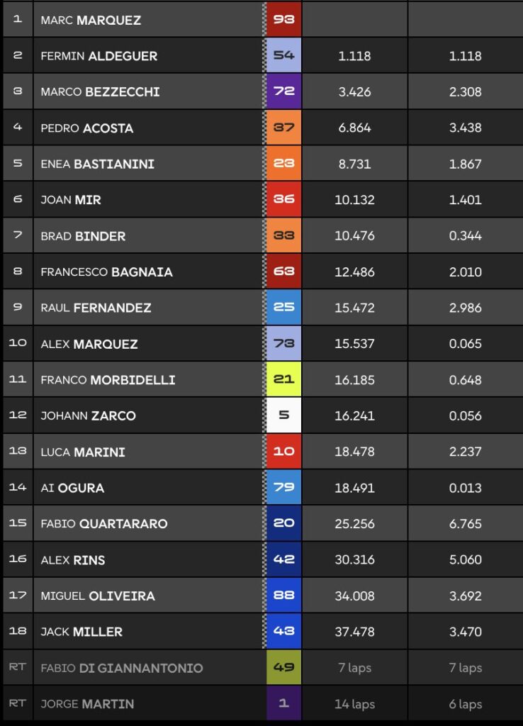 Finalmente, Marc Márquez lograba su primera victoria en el Red Bull Ring Spielberg. En segundo lugar, Aldeguer lograba su mejor resultado del año, con Bezzecchi completando el podio austríaco. Pedro Acosta lograba cruzar la línea de meta en cuarta posición, con Bastianini quinto. Joan Mir lograba también su mejor resultado, teniendo en cuenta la mala suerte del mallorquín, con un sexto puesto.