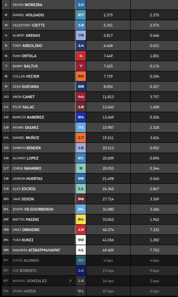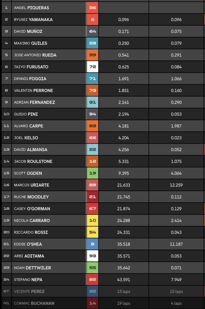 Moreira llegaba a la última vuelta con una ventaja de más de dos segundos con respecto a Holgado. El brasileño firmaba así su segunda victoria de la temporada. Dani Holgado ocupaba la segunda posición del podio, con Vietti en tercer lugar. Arenas, por su parte, se quedaba a las puertas del podio.