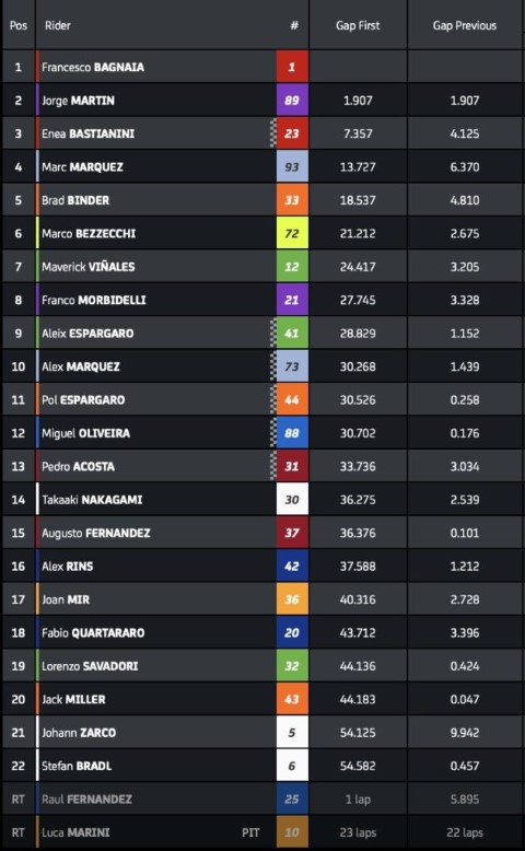 Paso a paso, Marc Márquez llegaba hasta la cuarta posición, tras adelantar a Bezzecchi y Binder. Por delante, Pecco Bagnaia sacaba casi dos segundos a Jorge Martín; que mantenía una ventaja de más de casi cinco con respecto a Enea Bastianini. Siete segundos por detrás de la Ducati oficial, Márquez trataba de acortar la distancia para pelear por el podio. Sin embargo, las últimas vueltas no han traído ninguna nueva pelea, con las posiciones de podio invariables desde prácticamente la primera vuelta