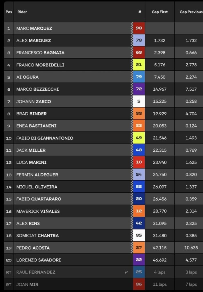 Finalmente, se repetía el podio vivido en la Sprint Race del sábado, con Marc Márquez subiendo a lo más alto del podio; su hermano Alex segundo y Bagnaia tercero. Morbidelli cruzaba la línea de meta en cuarto lugar, con Ogura logrando el Top5. Marco Bezzecchi, mientras, lograba la sexta posición, por delante de Johann Zarco y Brad Binder.