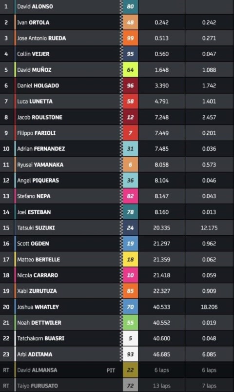 David Almansa era la primera víctima de la curva 5, sufriendo una caída a falta de catorce vueltas para la bandera a cuadros. Mientras, la lucha en la cabeza cambiaba de nuevo de protagonistas, con Holgado primero seguido por Luca Lunetta y Veijer. Poco después, era Joel Kelso quien se iba al suelo.