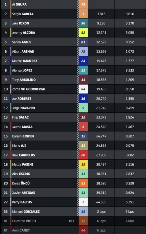 A falta de cinco vueltas para el final, Ai Ogura seguía de cerca a un Sergio García con aviso por sobrepasar los límites de la pista. El japonés aprovechaba la recta de meta para adelantar a su compañero de equipo y hacerse con el liderato. A más de seis segundos tras ellos rodaba Alonso López, ocupando la tercera posición con Dixon al acecho.