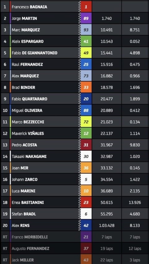 Con cuatro vueltas por delante, era Marc Márquez quien lanzaba el ataque sobre Aleix Espargaró, haciéndose con la posición de podio. Acosta llegaba hasta la zona de puntos tras su regreso a pista después de su caída. Mientras tanto, Bagnaia ampliaba décima a décima su ventaja con respecto a Martín; hasta lograr la victoria.