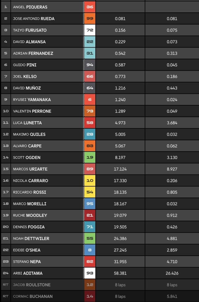 Vuelta a vuelta, Rueda llegaba hasta la primera posición, liderando por delante de Almansa y Piqueras. El sevillano no lo tenía todo hecho, como demostraba la última vuelta. En un intenso baile de adelantamientos, finalmente era Piqueras quien cruzaba la línea de meta en primera posición; con Rueda segundo y Furusato cerrando el podio.