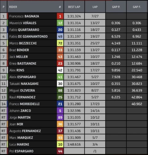 Con el gran número de caídas en carrera, Álex Rins llegaba hasta la novena posición en su primer Gran Premio tras la doble fractura de tibia y peroné en Mugello. Por delante, Fabio Quartararo continuaba a la caza de Viñales, mientras que la distancia entre el de Aprilia y Bagnaia se acortaba. El francés, sin embargo, no podía superar al catalán, y finalizaba tercero. Bagnaia conseguía la victoria al remontar desde la décimo tercera posición.