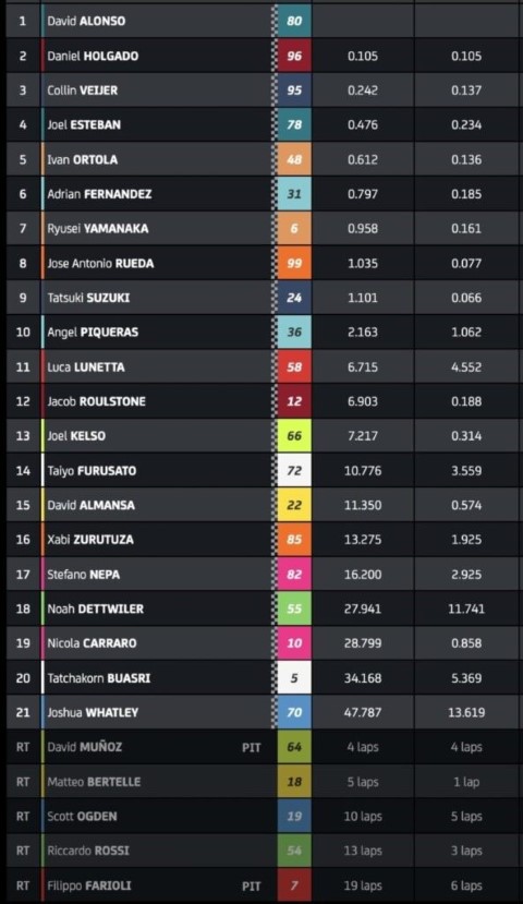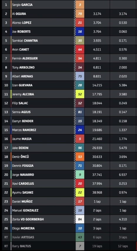Las últimas curvas han sido totalmente frenéticas. García lograba una cómoda victoria con un Ogura que cruzaba en segunda posición por delante de Alonso López. Joe Roberts se veía empujado fuera de la pista, teniendo que conformarse con el cuarto lugar. Arón Canet se ha visto relegado al sexto lugar; una plaza por delante de Fermín Aldeguer.