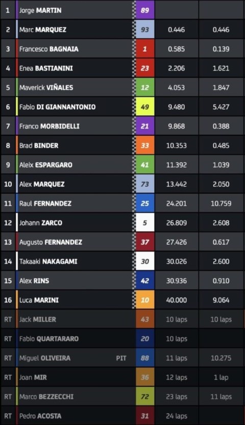 El tira y afloja de Márquez y Di Giannantonio se saldaba con el de Gresini situándose tercero. El italiano se iba largo, ocasión que aprovechaba Viñales para acercarse al de Cervera. A falta de diez vueltas para el final, Martín se echaba sobre Bagnaia en la pelea por la victoria. El madrileño finalmente lograba superar al italiano cuando faltaban siete vueltas para la bandera a cuadros; al tiempo que Márquez recortaba la distancia con los líderes. El de Gresini tenía que esperar hasta la última vuelta para atacar al de Ducati, para acabar cruzando la meta en segunda posición.