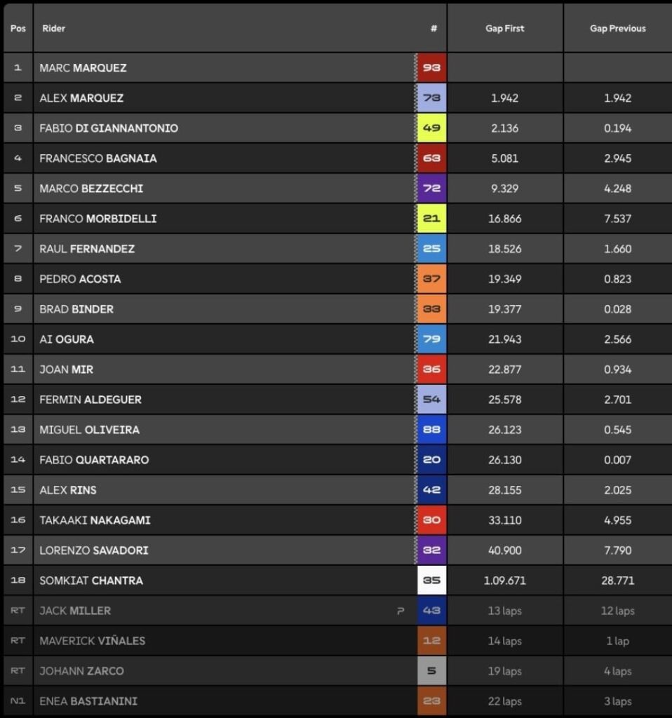 Con el paso de las vueltas, Bagnaia comenzaba a sufrir cada vez más. Esto daba la oportunidad, por un lado, a los hermanos Márquez escaparse. Por otro, a Di Giannantonio acercarse, con la vista fija en el podio. A falta de dos vueltas para el final, el piloto del VR46 dejaba al de Ducati fuera del podio. Finalmente, Marc Márquez repetía en lo más alto del podio, logrando su victoria número 93. Alex Márquez y Di Giannantonio han cerrado el podio.
