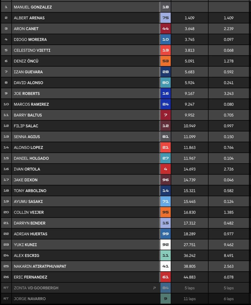 Con el paso de las vueltas, no obstante, Manu González llegaba hasta la primera posición; con Albert Arenas en segundo lugar y Arón Canet completando el podio provisional. Moreira, por su parte, se veía relegado a la cuarta posición con Öncü quinto. El brasileño, sin embargo, no daba su brazo a torcer, lanzando algunos ataques a Canet recuperando la tercera plaza.