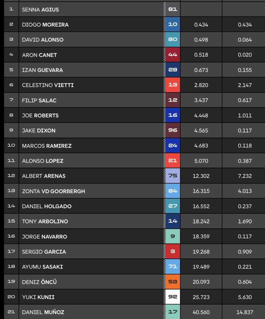 Tras una última vuelta de infarto, Senna Agius aprovechaba la pelea entre Alonso y Canet para cruzar la línea de meta en primera posición. Diogo Moreira cruzaba en la segunda posición, con David Alonso tercero, logrando su primer podio en la categoría intermedia. Canet, en medio del caos, terminaba cuarto.