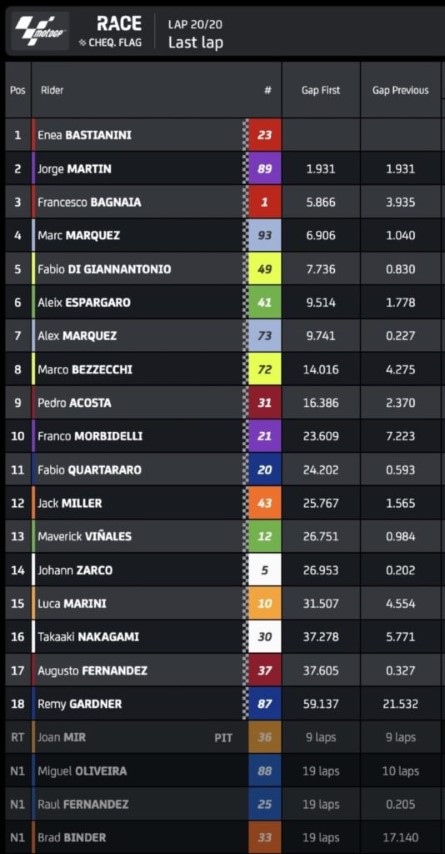 Aleix Espargaró lograba recuperarse del toque con Martín, llegando hasta el cuarto lugar por delante de Marc y Alex Márquez. Un fallo de Bastianini permitía a Martín situarse segundo, con La Bestia completando el podio provisional. Esto permitía a Bagnaia abrir el hueco en medio segundo.