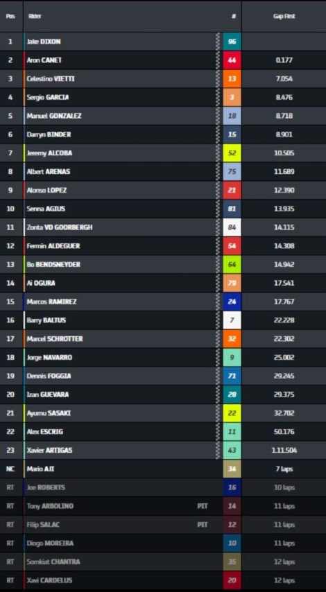 Dixon tomaba la delantera en la búsqueda de la victoria, aunque Canet no daba su brazo a torcer. El valenciano se acercaba peligrosamente en la última chicane, aunque finalmente no podía superar a Dixon. Celestino Vietti ha ocupado la tercera posición, con Sergio García cuarto y Manu González quinto.