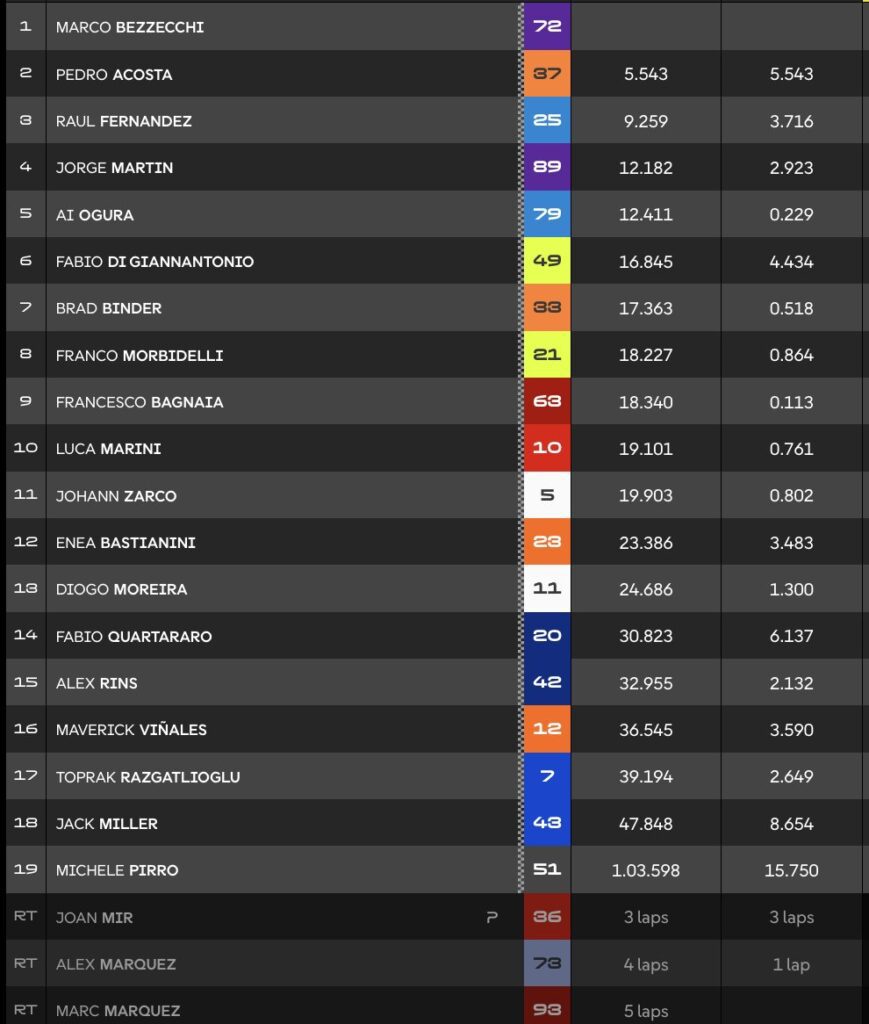 Fernández no tardaba en atacar a Márquez para hacerse con la segunda posición. Poco después, era Martín quien metía la moto al Campeón del Mundo; aunque el de Ducati le devolvía el adelantamiento. Mientras Bezzecchi aumentaba su ventaja décima a décima, Acosta adelantaba a Diggia haciéndose con la quinta posición. Unos instantes después, Jorge Martín hacía lo propio con el mayor de los Márquez, situándose en situación de podio.