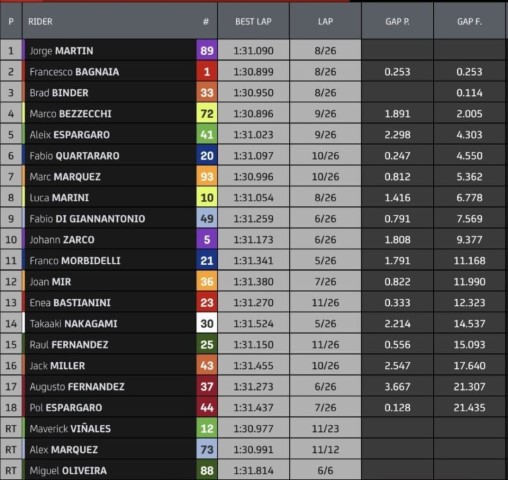 Bagnaia protagonizaba un increíble adelantamiento que casi lo situaba en la cabeza de carrera; sin embargo el piloto de Ducati se abría y regresaba a la tercera posición. Binder, mientras, era incapaz de superar a Martín. El piloto del Pramac Ducati cruzaba la línea de meta en primera posición, con Binder y Bagnaia completando el podio. Sin embargo, Binder era penalizado con una posición al haber pisado el verde en la última vuelta, lo que daba al italiano el segundo lugar.
