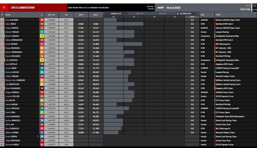 Por atrás, Sergio García se consolidaba en la tercera posición. El valenciano mantuvo dicha distancia, logrando el subcampeonato de Moto3; además, Adrián Fernández terminó sexto; David Muñoz, séptimo; y Diogo Morieira, octavo. El brasileño, coronándose como el mejor ‘rookie’ del 2022.