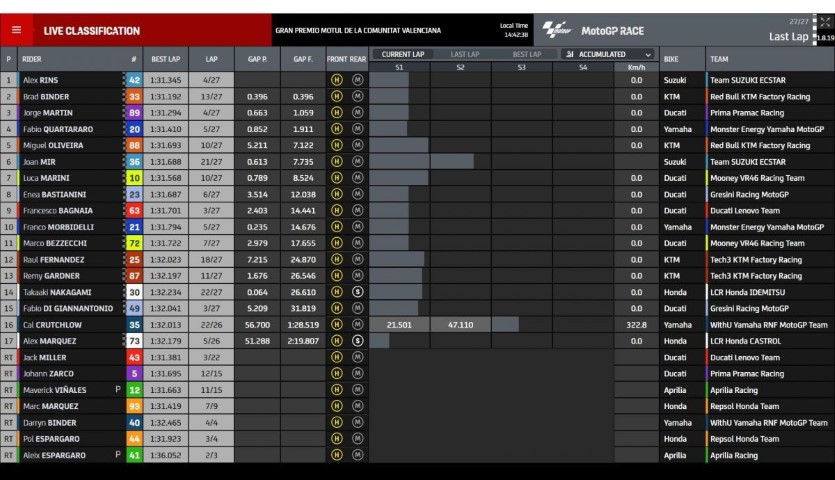 En la carrera, Rins fue el claro protagonista y claro vencedor de la carrera; con el de Suzuki, Binder y Martín le acompañan en el podio de Valencia. Quartararo rozó el podio y Bagnaia, que terminó noveno, se proclamó Campeón del Mundo de MotoGP.