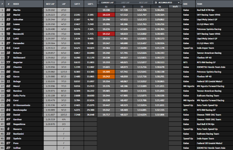 Cuando la pista ya estaba en condiciones de retomar la competición, se inició el procedimiento rápido de parrilla donde Jorge Martín salía en pole al haber sido primero en el último paso por línea de meta antes de la bandera roja. El piloto de KTM ha reanudado la carrera con la misma estrategia: tirar y escaparse. A medida que pasaba la carrera iba aumentando el espacio entre él y Luca Marini, que a su vez tenía colchón sobre Marcel Schrötter. La pelea estaba detrás en el grupo de batalla por el top 5 con Vierge, Lowes y Bezzecchi y más atrás entre Canet, Fernández y Luthi. Por su parte, Martín conseguía hacerse con su primer triunfo en Moto2.