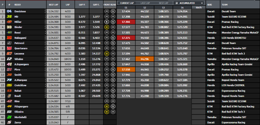 La segunda carrera comenzaba con Pol en la pole haciendo frente a la potencia de las Ducati. Pero el liderato no le iba a durar mucho, ya que Miller no quería soltar el primer puesto y comenzó a tirar camino de su segunda corona en MotoGP. Mientras tanto, algo le estaba pasando a Maverick Viñales marchando en decimoctava plaza, así como a Pol, posible resultado de haber cambiado de compuestos de neumáticos en la bandera roja. Además, instantes después se iba al suelo en la curva 4 junto a Miguel Oliveira. Alex Rins y Cal Crutchlow se sumaban a la lista de corredores que hoy se iban a la grava.