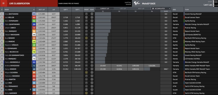 Finalmente, Bastianini ha logrado su tercera victoria de la temporada. Jack Miller ha cruzado la línea de meta en segunda posición, con Aleix Espargaró cerrando el podio. Fabio Quartararo se ha quedado a las puertas del podio, con su compatriota Johann Zarco quinto. Marc Márquez ha logrado la sexta plaza, seguido por Takaaki Nakagami y Brad Binder. Luca Marini ha cerrado el Top10 en el Gran Premio de Francia.