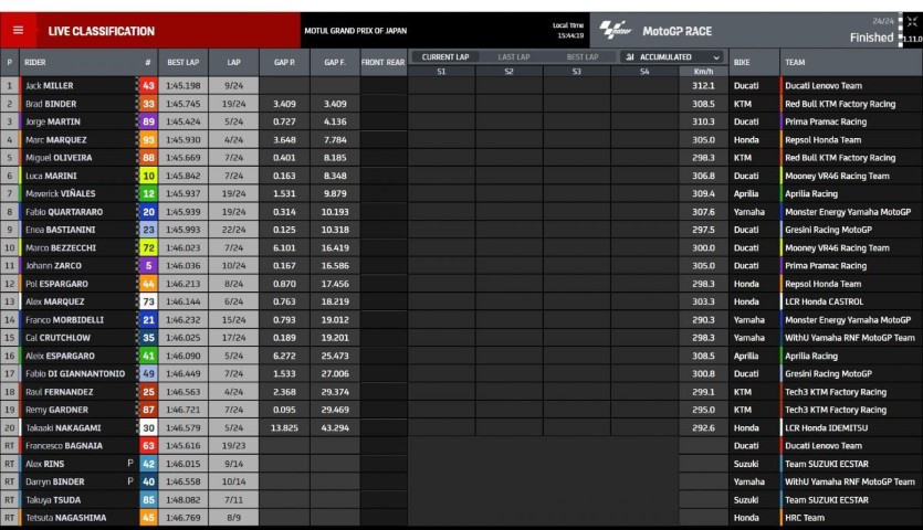 Cada vez queda menos para que llegue el final, y cada vez queda menos para saber quién se alza con el título. Se antojaba una carrera complicada para los tres primeros del campeonato. Finalmente, solo Fabio Quartararo ha logrado sonreír pese a quedar octavo. Y es que el francés se ha aprovechado de los dos ceros cosechados por Aleix Espargaró y Pecco Bagnaia. Aún así, en Ducati deben estar felices: Jack Miller se ha llevado la carrera en Motegi y Jorge Martín ha quedado en una más que importante tercera posición. Justo en medio de ambos, Brad Binder.