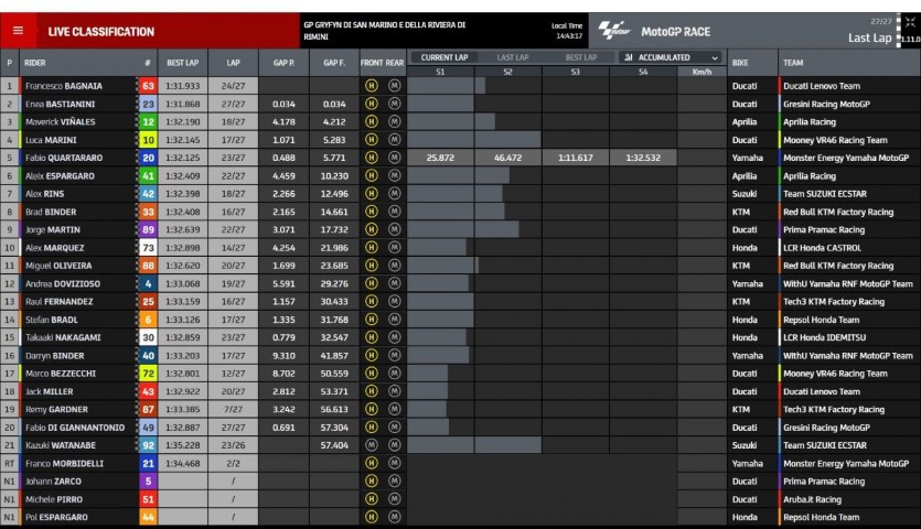 El Gran Premio de San Marino de la presente temporada lo recordaremos varios años. Por lo sucedido en MotoGP con Pecco Bagnaia, por el triplete histórico en Moto2, por una nueva carrera agónica en Moto3. En la categoría reina fue Pecco Bagnaia el claro protagonista al conseguir la cuarta victoria seguida. Un triunfo de principio a fin, demostrando que está en el mejor momento de toda la temporada y acechando a Fabio Quartararo en la general: Aleix Espargaró ya es tercero. En el podio de San Marino, además del mencionado Bagnaia están Enea Bastianini y Maverick Viñales.