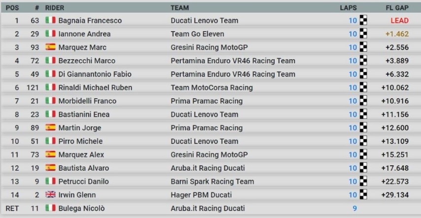 El semáforo se ha apagado con una gran salida de Pecco Bagnaia, que se situaba en cabeza. Jorge Martín y Fabio Di Giannantonio tenían problemas en la primera curva, saliéndose de la pista. Iannone se colocaba a rueda de Bagnaia, con Bulega en tercera posición y Marc Márquez en el cuarto lugar. Con diez vueltas por delante, Bagnaia usaba su estrategia habitual en MotoGP: liderar desde los primeros compases para marcar su ritmo.
