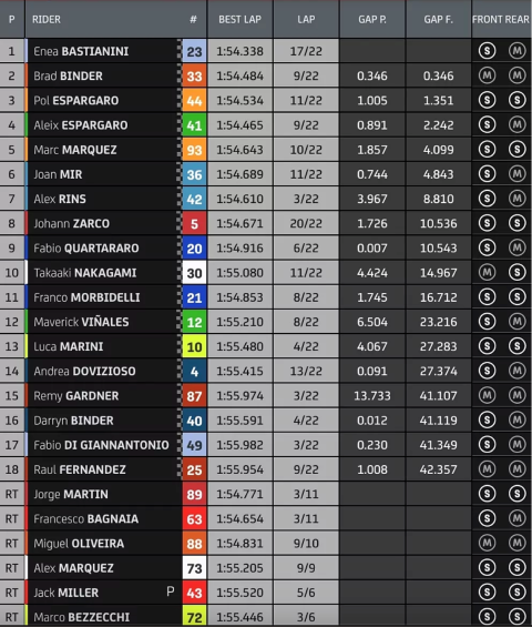 Lo esperábamos con ansia, y ya hemos disfrutado de ella. Hablamos de la primera carrera de la temporada en MotoGP. Una carrera que entra en la historia con Enea Bastianini como claro protagonista. El piloto ha italiano ha culminado un domingo perfecto para sus compatriotas. La bestia luchó hasta el final para alzarse con la victoria, una victoria que luego le ha dedicado a Fausto Gresini. Poco a poco fue recortando distancia a Pol Espargaró y luego tuvo que controlar a Brad Binder. Finalmente, el sudafricano ha terminado segundo; el español de Honda, que ha liderado gran parte de la prueba, tercero. También cabe destacar el enorme papel de Aleix Espargaró, que también ha conseguido una hazaña importante para Aprilia: han conseguido la distancia más pequeña respecto al líder de toda su historia en la categoría reina.