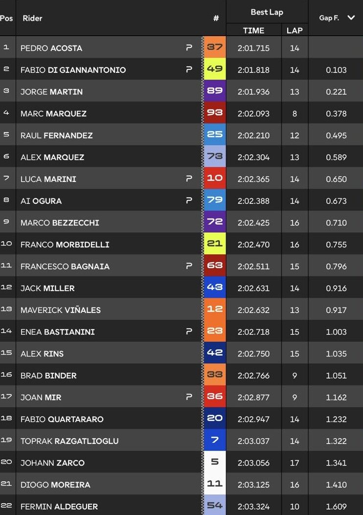 Tras marcar este tiempo, Di Giannantonio ha rebajado aún más su tiempo. Mientras, Martín ha mejorado su registro y ha subido hasta la segunda posición. Acosta, desde la cuarta plaza, se acercaba a Di Giannantonio. Tanto que, a falta de dos minutos, ha firmado el mejor crono de la sesión, fijándolo en 2:01.715. Mientras tanto, Marc Márquez cruzaba la línea de meta a dos décimas de Acosta, subiendo hasta la cuarta posición a pesar de haberse perdido gran parte de la sesión.
