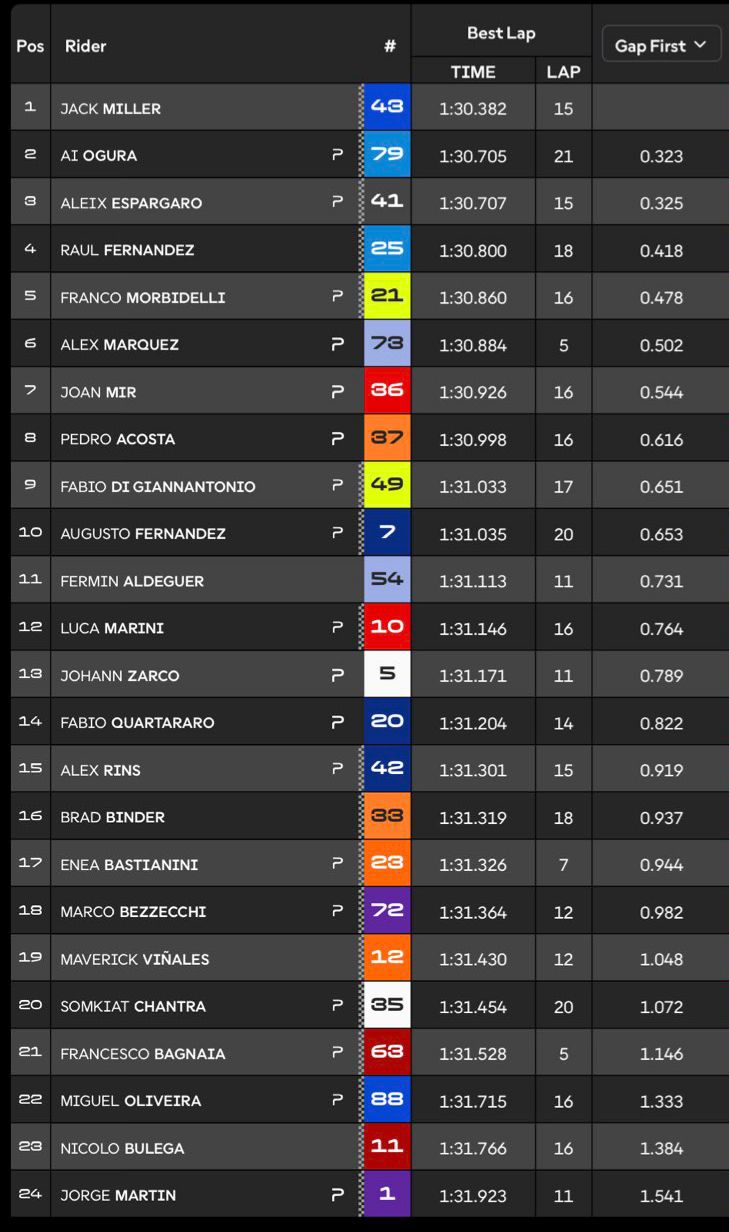 Bandera a cuadros para finalizar la sesión: Miller, Ai Ogura y Aleix Espargaró completaban el Top3, seguidos de Raúl Fernández, Morbidelli y Alex Márquez. Situación inusual en MotoGP, pues tenemos en primera posición a una Yamaha, seguido de una Aprilia satélite y una Honda.