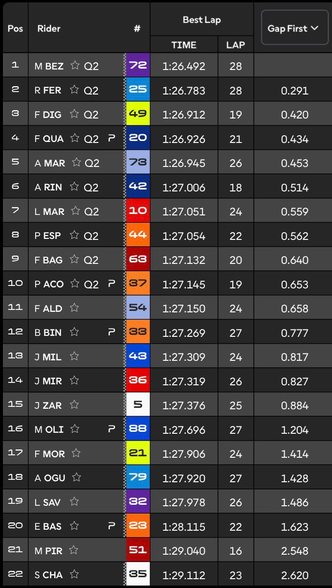 Di Giannantonio mejoraba 33 milésimas el tiempo de Bezzecchi y se colocaba primero. Pedro Acosta se caía al suelo en la curva cuatro, sin mayores consecuencias. Alex Rins sorprendía y, por el momento, se colocaba tercero. Jack Miller era el siguiente en sorprender, pues se colocaba primero. Pero poco le duraba la alegría al australiano, pues Marco Bezzecchi volvía a la primera posición, seguido de Álex Rins. A la siguiente vuelta, el italiano batía su propio tiempo y se colocaba a 1:26:580.