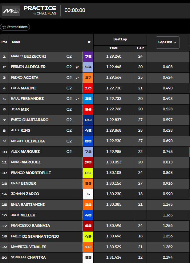 A falta de diecisiete minutos para el final, Marc Márquez volvía a salir para registrar tiempo, pues el piloto actualmente estaba en 1:31:877. Así pues, Marc marcaba su primer registro dentro de los diez primeros y se colocaba sexto. Pedro Acosta era el rival a batir por el momento, pues seguía en primera posición. Pero Bezzecchi no le dejaba oportunidad y le robaba la primera posición.